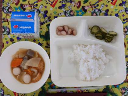 献立は、関東煮、きゅうりの梅風味、とら豆の煮ものです。