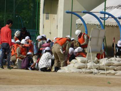 消防署、区役所防災担当、大和川右岸水防事務組合等7団体の協力を得て、南港南校区合同防災訓練を行いました。幼稚園児からご高齢の方まで700人超の方に参加していただき「つながり」をテーマに、交流を深めながら防災教育プログラムを体験していただきました。