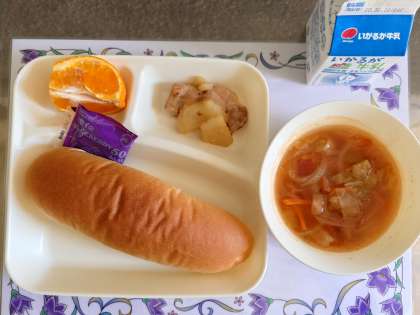 献立は、鶏肉とじゃがいものガーリック焼き、ウインナーとてぼ豆のスープ、デコポンです。