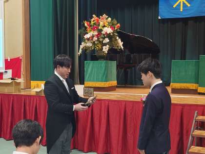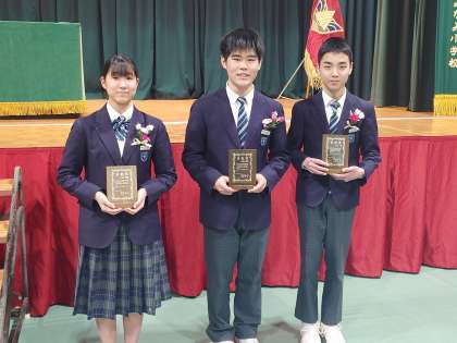 3年間一度も欠席・遅刻・早退がなかった3名に、オリジナルプレートの皆勤賞が贈られました。