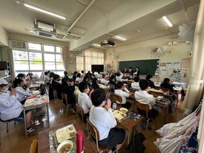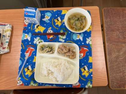 今日の給食はごはん、牛乳、鶏肉のからあげ、中華スープ、チンゲンサイともやしの甘酢あえです。今日は6年2組のいただきますの様子です。