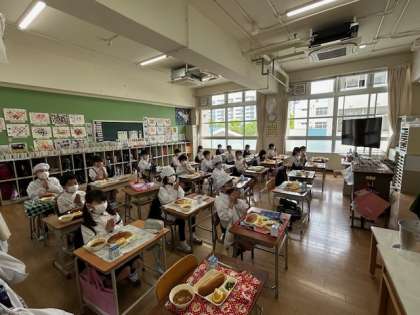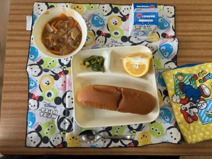 今日の献立は、こくとうパン、牛乳、ビーフシチュー、さんどまめとコーンのさらだ、あまなつかんです。今日は3年2組、元気いっぱい「いただきます!!」