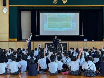今日は住之江警察署からお越しいただき、小学校で交通安全教室実施しました。1時間目は4・5・6年生、2時間目は1・2・3年生。自転車の乗り方などの交通ルールやおうちの周りの危険な場所等についてクイズも交えながら学習しました。今日勉強したことをしっかり守り、交通安全に努めましょうね。