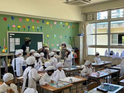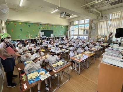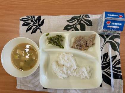 今日の献立は、ごはん、牛乳、豚肉のしょうが焼き、とうふのみそ汁、じゃこピーマンです。今日は1年生2組の様子。6年生のお手伝い期間も終え、今は自分たちで準備もしています。大きな声で「いただきます!」