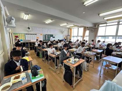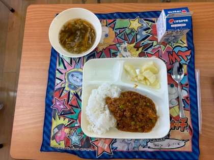 今日の献立は、タコライス、牛乳、もずくのスープ、焼きじゃがです。もずくは、ホンダワラなどの海藻にくっついて育ちます。「藻につく」から「もずく」と呼ばれるようになりました。今日は8年1組の様子。元気いっぱい「いただきまーす!」