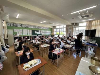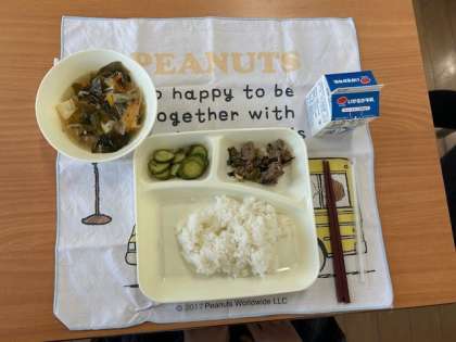 今日の献立は、ごはん、牛乳、プルコギ、とうふとわかめのスープ、きゅうりの甘酢づけです。プルコギの「プル」は「火」、「コギ」は「肉」という意味で、合わせて「火で焼いた肉」という意味だそうです。今日は5年2組におじゃましました。手を合わせて、「いただきます!!」