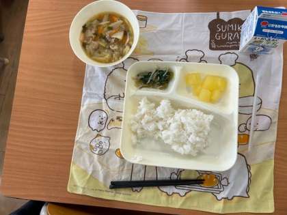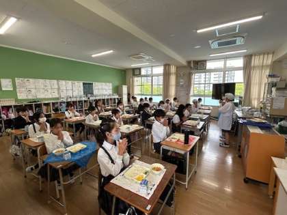 今日の献立はごはん、牛乳、中華煮、チンゲンサイともやしのしょうがあえ、りんご(カット缶)です。今日は4年1組の様子です。写真の撮影にもみんな協力的でした。みんな元気に「いただきます!」