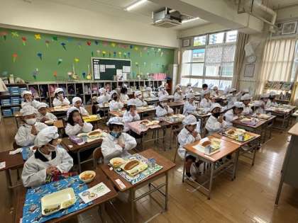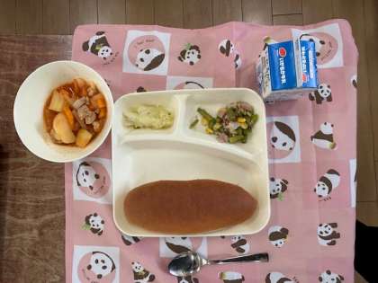 今日の献立は、黒糖パン、牛乳、ケチャップ煮、ベーコンとさんどまめのソテー、キャベツのバジル風味サラダです。今日は1年2組の様子。配膳もかなり上手になりました。元気よく手を合わせて「いただきます!!」