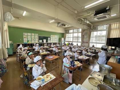 今日の献立は、かやくご飯、きざみのり、牛乳、みそ汁、まっ茶ういろうです。今日は2年生2組の様子。写真の立候補をしてくれる児童がとても多く、協力的でした。みんな元気よく「いただきます!!」
