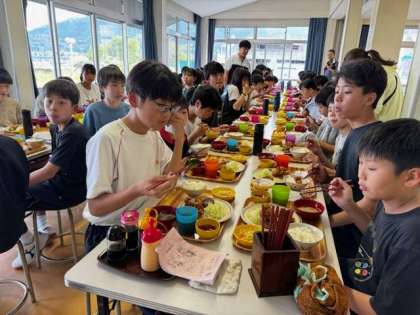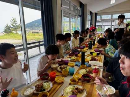 食事係さんが準備をしてくれて、夕食開始です。早くもふりかけ、ご飯のおかわりがきています。