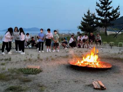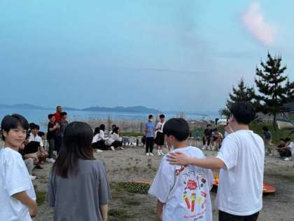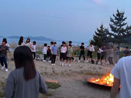 キャンプファイアー後、そのままレクリエーションをしています。レク係さんがこれまで、放課後残って準備をしてくれたゲームをして盛り上がりました。