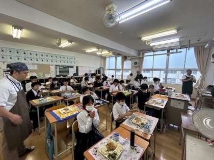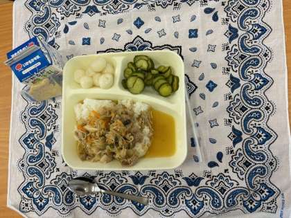 今日の献立は、豚丼、牛乳、きゅうりの梅風味、白玉だんご、きな粉です。白玉だんごは白玉粉と呼ばれる米の粉でつくっただんご。一般的に広まったのはなんと江戸時代だそうです。その頃から親しまれてきた食べ物なのですね。今日は7年生2組の様子。元気よく「いただきます!」