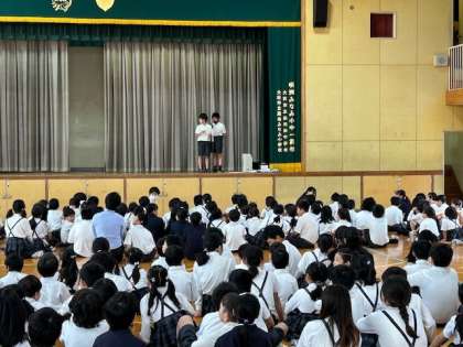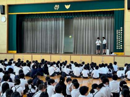 今日は体育館にて小学生の児童集会を行いました。今日の内容は「何が通ったでしょう?クイズ」全問正解できたかな?