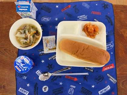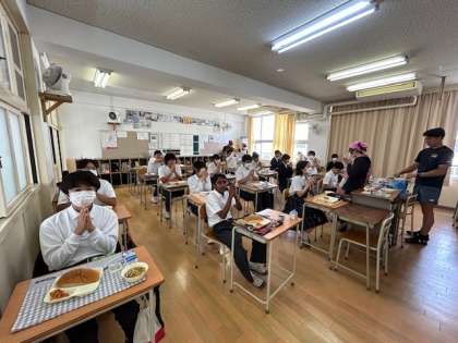 今日の献立は、コッペパン、牛乳、みかんジャム、ヨーグルト、えびのチリソース、中華スープです。先週金曜日に続き、今日も牛乳、ヨーグルトなどカルシウムをつくる食べ物がいっぱい。好き嫌いなく食べ、しっかりからだをつくりましょう。今日は9年2組の様子です。「いただきます!」