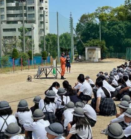 本日2限目、火災を想定した避難訓練を行いました。避難放送が入ってから、全員の点呼が終わるまで4分13秒、非常にスムーズに避難できました。