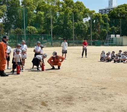 また、住之江消防署南港出張所より消防士の皆様にお越しいただき、火災が起こった時の対応や消火器の使い方についてレクチャーをしていただきました。