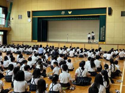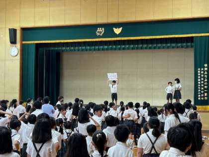 今日の小学校児童集会は3ヒントクイズ。「1.青いです 2.鼻が赤いです 3.かわいいです」う〜ん、難しい... 答えはあるアニメキャラクターでした。みんな協力的で盛りあがっていました。全問正解者もたくさんいました。