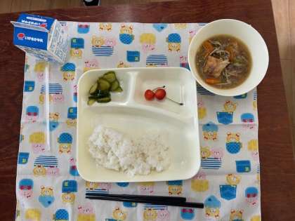 今日の献立は、ごはん、牛乳、牛肉と野菜の炒め煮、きゅうりのしょうゆがけ、焼きのり、さくらんぼです。さくらんぼは初夏のおとずれを感じることができる果物。給食で生のさくらんぼが登場するのはなんと年に1回だけ。レアですね。今日は4年2組の様子。「いただきます!」