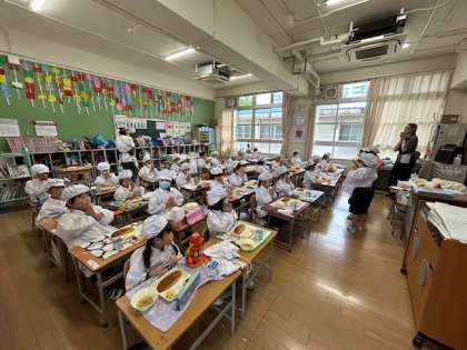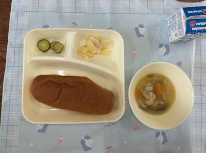 今日の献立は、こくとうパン、牛乳、鶏肉とでぼ豆のスープ煮、ベーコンとじゃがいものチーズ焼き、きゅうりとコーンのサラダです。今日は1年1組の様子です。元気いっぱい「いただきます!」