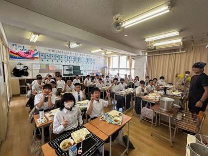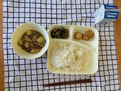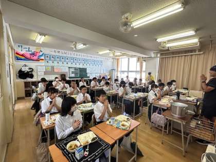 今日の給食は、ごはん、牛乳、肉じゃが、あつあげのみそだれかけ、オクラのおかかいためです。オクラは、エジプトでは古くから食べられていました。切り口が星のような形をした緑色のものがよく出回っていますが、丸い形のものもあります。今日は7年1組の様子。全員そろって「いただきます!」