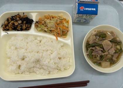 今日の献立は、ごはん、牛乳、豚肉とじゃがいもの煮物、ひじき豆、ささみと野菜のごまみそ焼きです。今日は給食委員会より、給食を食べるための環境を整えようという放送がありました。みんなで協力すると準備も早く終わり、ゆっくり食事をすることもできますよね。今学期もあと一日ですが、しっかり意識したいですね。