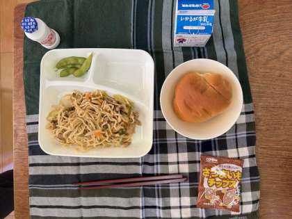 今日の献立は、ミニコッペパン、牛乳、焼きそば、えだまめ、おさつチップス、発酵乳です。久しぶりの給食、クラスのみんなと食べる給食は最高ですね。今日は8年1組の様子。給食を食べて午後のテストもファイト〜!!「いただきます!」