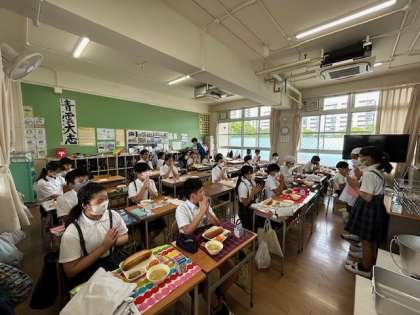 今日の献立は、加工パン、牛乳、焼きハンバーグ、豆乳スープ、冷凍みかんです。今日は給食委員会から食器の並べ方について放送がありましたね。参考にしましょう。今日は6年1組の様子。みんなで「いただきます!」
