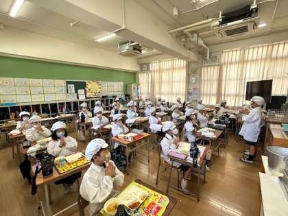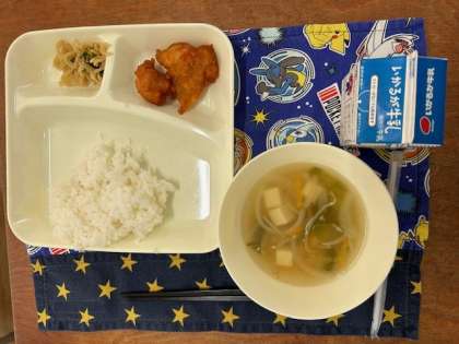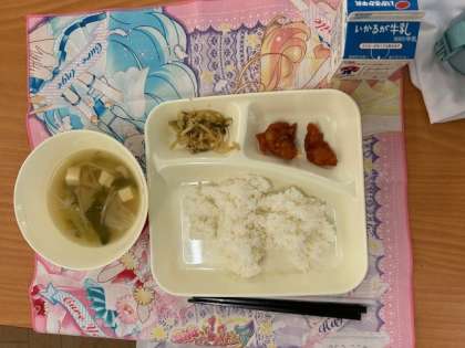 今日の献立は、ごはん、牛乳、ヤンニョムチキン、とうふのスープ、切干しだいこんのナムルです。今日は2年2組の様子。静かに配膳ができていました。みんなそろって「いただきます!!」