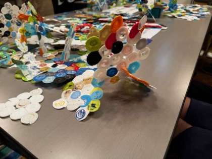 美術部生徒が、作品の見学やペットボトルキャップを使った製作体験をしました。