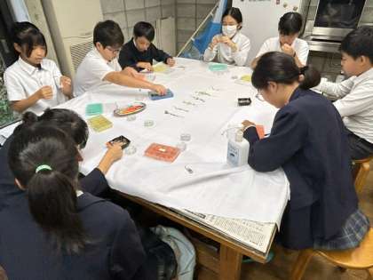 本日最初の取り組みは海の博物館で展示見学と貝殻ストラップづくりです。施設内にはなんと大きなカニの姿も…