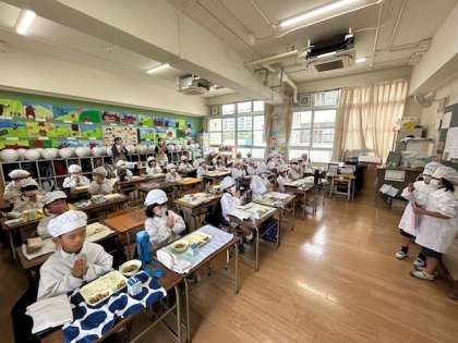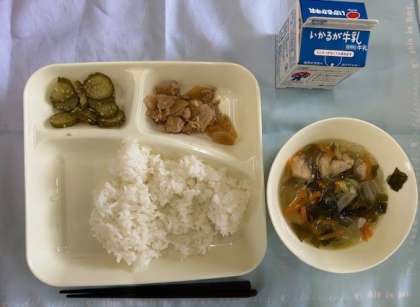 今日の献立は、ごはん、牛乳、豚肉のコチジャンいため、鶏肉とはるさめのスープ、きゅうりのナムルです。コチジャンは米みそ、とうがらしなどから作られる食品です。今日は2年1組の様子。手を合わせて「いただきます!」