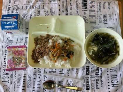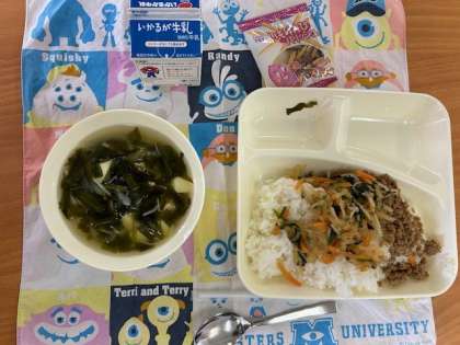 今日の献立は、ごはん、牛乳、ビビンバ、わかめスープ、いもけんぴフィッシュです。今日のビビンバに使われているほうれんそうは、体の調子を整える緑のグループの食べ物で、冬が旬の野菜です。寒い時期のほうれんそうは、甘みが増してさらにおいしくなります。