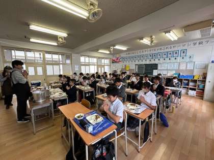 今日は7年1組の様子。みんなで協力し、配膳が予定時刻よりも早くできていました。元気よく「いただきます!」