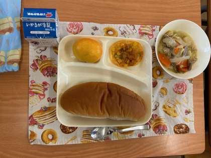 今日の献立は、黒糖パン、牛乳、豚肉と野菜のスープ煮、変わりピザ、みかんです。今日は給食委員から心を込めてあいさつをしようというお話がありました。動物や植物の命をいただいていることや、食事ができることへの感謝の気持ちをこめて「いただきます」のあいさつをしましょう。