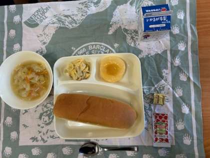 今日の献立は、コッペパン、バター、牛乳、ツナポテトオムレツ、スープ、ケチャップ、白桃(缶)です。
