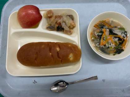 今日の献立は、おさつパン、牛乳、りんご、さけのマリネ、肉だんごと押麦のスープです。マリネ液は、たまねぎをオリーブ油でいためたあと、砂糖、塩、米酢、オリーブ油、ワインで味付けしたものです。今日の給食は、あげたさけにマリネ液をからませた「さけのマリネ」です。「いただきます!」