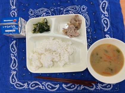 今日の献立は、ごはん、牛乳、豚肉のしょうが焼き、さつまいものみそ汁、きくなとはくさいのごまあえです。大阪市の給食では、大阪産のきくなをなるべく使うようにしています。住んでいる地域でつくられた食べ物のことを「地場産物」といいます。近い場所でつくられ、運ばれるので、新鮮なものが手に入ります。地場産物を学校給食に使用することで、地域の食や食文化などについて理科を深めることができます。