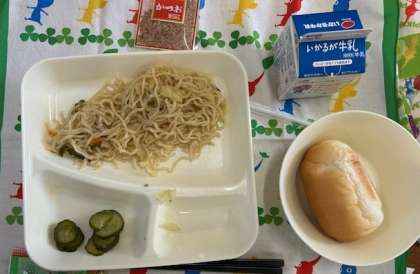 今日の献立は、ミニコッペパン、和風焼きそば、かつおぶし、きゅうりのしょうゆがけ、ソフト黒豆です。