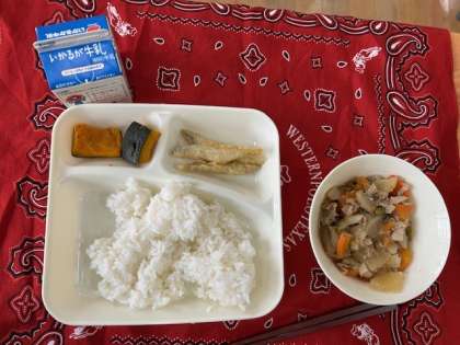 今日の献立は、ごはん、牛乳、きびなごのてんぷら、含め煮、焼きかぼちゃの甘みつかけです。日本では昔から、「ん」がつく食べ物を冬至に食べると、運がよくなるといわれています。「ん」が二つ入るとさらによいとされ、その一つがかぼちゃ(なんきん)です。これは、冬まで保存することができ、たくさんの栄養素を含んでいるかぼちゃを食べることで、寒い冬を乗り切ろうという昔の知恵でもあります。