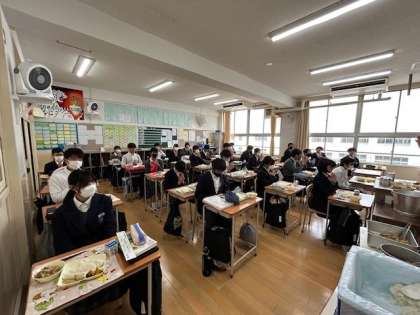 今日は8年1組の様子。手を合わせて、「いただきます!!」