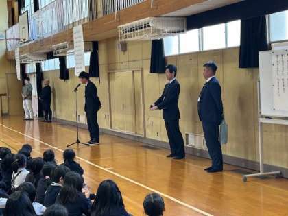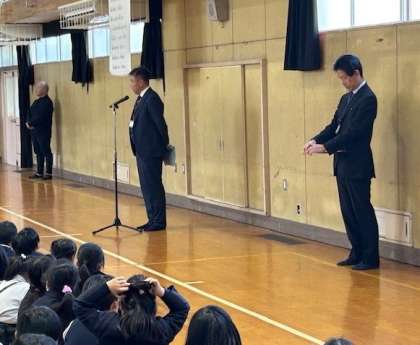 本日、体育館にて2学期の終業式を行いました。小学生の軟式野球の表彰に続き、学校長からは「支える」ことの大切さについて、また、冬休み安全に過ごしてくださいとのお話がありました。続いて生活指導担当より「規則正しい生活を送ること」「大掃除など家のお手伝いをすること」「無駄遣いやお金の貸し借りなどをしないように」といったお話がありました。