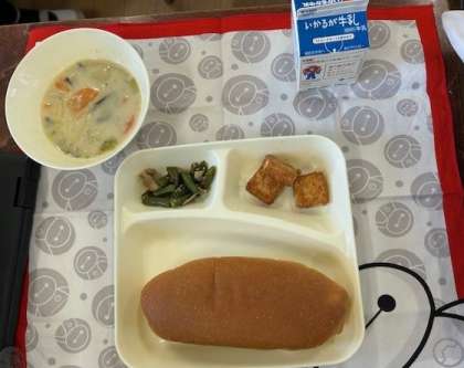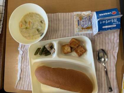 今日の献立は、コッペパン、牛乳、はくさいのクリーム煮、あつあげのピリ辛じょうゆかけ、豚肉とさんどまめのオイスターソースいため、みかんジャムです。