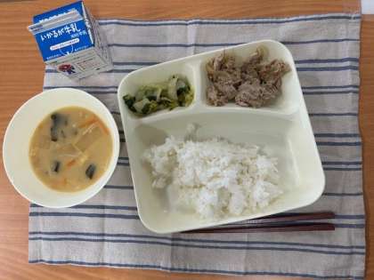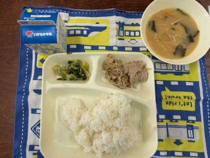 今日の献立は、ごはん、牛乳、豚肉のごまだれ焼き、みそ汁、きくなとはくさいのおひたしです。今日のみそ汁は、にぼしからとった「にぼしだし」を使っています。にぼしは、主に「かたくちいわし」などの小魚を煮てから乾燥させたものです。にぼしからとっただしにはうま味成分がたくさんふくまれています。