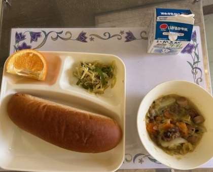 今日の献立は、黒糖パン、牛乳、ポトフ、カレーソテー、いよかんです。ポトフとは、肉や野菜、香草などを煮込んだフランスの家庭料理のひとつです。フランスでは煮込んだ肉、野菜をスープと別々に盛り付けて食べます。給食では牛肉やウインナー、じゃがいも、キャベツ、にんじん、パセリを使っています。