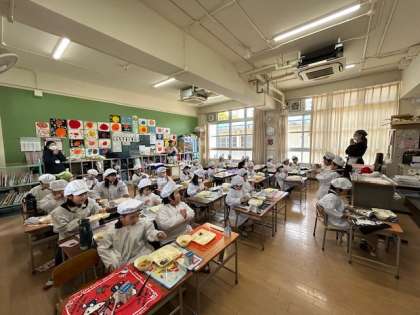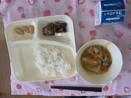 今日の献立は、ごはん、牛乳、くじらのたつたあげ、豚肉とじゃがいもの煮もの、白花豆の煮ものです。日本では、昔からくじらを使ったさまざまな料理が食べられてきました。肉だけでなく、皮や内臓、尾びれまで工夫して使うことができるため、くじらは「捨てるところがない」といわれています。
