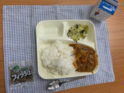 今日の献立は、ハヤシライス、牛乳、キャベツのひじきドレッシング、ミニフィッシュです。食べ物の味は5つ(酸味、甘味、うま味、塩味、苦み)あり、基本味とよばれています。舌にある「味らい(みらい)」が食べ物の味を受けとって脳に伝えています。