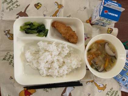 今日の献立は、ごはん、牛乳、たらフライ、うすくず汁、こまつなのごまあえ、おさつチップス(中学のみ)です。今日は給食委員会より正しい「はし」のつかい方についてお話がありました。「はし」を正しく使うことで、料理が食べやすく、また、見た目的にも気持ちの良いものです。正しく使うように心がけましょう。