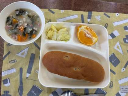 今日の献立は、レーズンパン、牛乳、鶏肉とほうれんそうのシチュー、キャベツのサラダ、デコポンです。デコポンは冬から秋にかけておいしい時期の果物です。甘くて食べやすいため、人気があります。熊本県や愛媛県、和歌山県などで多くつくられています。