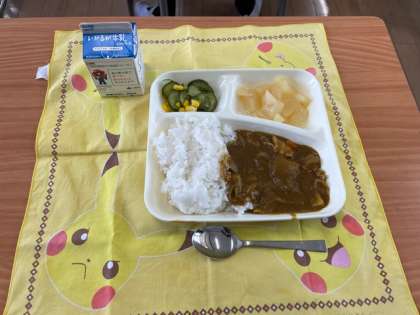 今日の献立は、牛乳、缶詰め洋なし、チキンレバーカレーライス、きゅうりとコーンのサラダです。