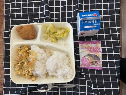 今日の献立は、かつ丼、牛乳、キャベツの梅風味、いもけんぴフィッシュです。